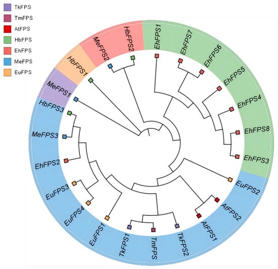 - Cheng, H.; Li, L.; Cheng, S.; Cao, F.; Wang, Y.; Yuan, H. Genome-wide identification and expression analysis of the farnesyl pyrophosphate synthase (FPS) gene family in Hevea brasiliensis. Ind. Crops Prod. 2020, 145, 112102. [Google Scholar]