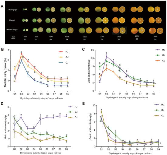 (A) Morphological changes during fruit development and ripening of the three cultivars (‘Hungjinjia’, ‘Kiyomi’ and ‘Harumi’). (B) TA content of citrus. Changes in citric acid (C), malic acid content (D) and quinic acid (E). Error bars indicate the standard error of total substance content, and different letters indicate signifi-cant differences in total content, p < 0.05.