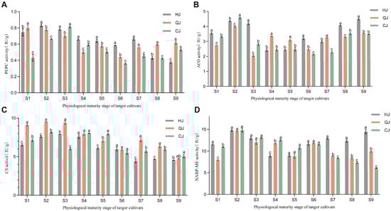 Changes in PEPC (A), ACO (B), CS (C), and NADP-ME (D) activities during citrus fruit development. Data are expressed as the mean of three biological replicates. Error bars indicate the standard error of total substance content, and different letters indicate signifi-cant differences in total content, p < 0.05.