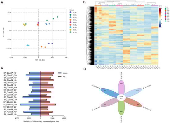 The differential genes of the three late-maturing hybrid citrus varieties at S2, S4, and S7 were compared two at a time, and the statistical findings from this study are visually represented in the figure (Figure 3C). From the two-by-two comparison groups, the greatest number of DEGs was discovered in S7 vs. S2, with 6017 genes (2553 up-regulated genes and 3464 down-regulated genes) in S7_QJ vs. S2_QJ. Furthermore, when comparing the DEGs across different varieties within the same timeframe, it was evident that the number of DEGs was notably higher in HJ compared to the other varieties (QI and CJ). For instance, S4_CJ vs. S4_HJ exhibited 4025 DEGs (comprising 2077 up-regulated and 1948 down-regulated genes), whereas S4_QJ vs. S4_HJ showed 4212 DEGs (including 2184 up-regulated and 2028 down-regulated genes). In conclusion, S2 and S7 appear to be critical periods for the distinct alterations in the growth metabolism of late-maturing hybrid citrus varieties. During these time periods, notable metabolic variations were observed between HJ and the other two varieties.