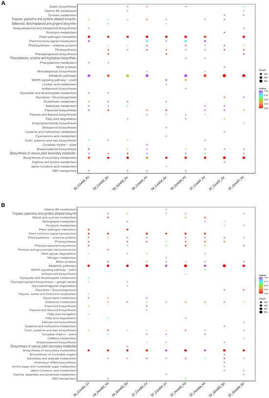 To identify the biometabolic pathways linked to the DEGs obtained from the screening, enrichment analysis was performed against the reference pathways in the KEGG database. Bubble plots that show the KEGG enrichment analysis of DEGs across several kinds at a single timepoint (Figure 4A) and within the same variety at different timepoints (Figure 4B) are used to graphically illustrate the results. The KEGG analysis uncovered notable enrichment of metabolic pathways, biosynthesis of secondary metabolites, plant pathogen interactions, and four pathways related to plant hormone signal transduction.