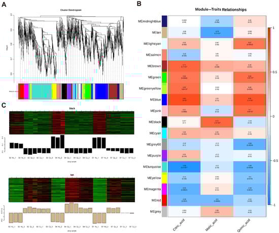 (A) The transcripts were partitioned into 18 modules by WGCNA based on gene correlation. The composite modules were then associated with organic acid components for correlation examination (B), focusing on the gene expression patterns of the MEtan and MEblack modules (C).