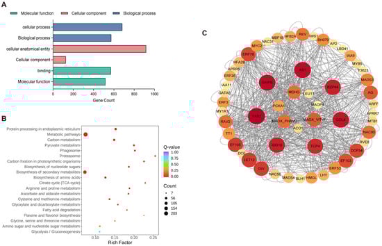 GO enrichment analysis of the 1162 selected genes revealed significant enrichments in the cellular anatomical entity category, with additional enrichments in protein-containing complexes under the cellular component category. The 1162 chosen genes underwent GO enrichment analysis, which showed notable enrichments in the cellular anatomical entity category and further enrichments in protein-containing complexes under the cellular component category. The main annotations for molecular function included “binding” and “catalytic activity”, while the top annotations for biological process were “cellular process” and “metabolic process” (Figure 6A). “Metabolic pathways” and “biosynthesis of secondary metabolites” showed high enrichment, according to the KEGG analysis results. Additionally, it was shown that the pathways “glycolysis” and “citrate cycle (TCA cycle)” were similarly enriched (Figure 6B). These two pathways play a crucial role in cellular metabolism and are closely related to citric acid metabolism. Glycolysis and the TCA cycle are not only linked to each other but also work together to regulate intracellular citric acid concentration, which in turn affects the entire process of organic acid metabolism. Within the four modules analyzed, these genes are involved in various key enzymes that participate in important biological processes such as citric acid metabolism, carbohydrate metabolism, and amino acid metabolism. Specifically, the identified genes include the following: an ACO gene (CICLE_v10024840mg), which encodes ACO, a key enzyme in the citric acid cycle that catalyzes the conversion of aconitate to isocitrate; a PEPC gene (CICLE_v10025088mg), which encodes PEPC, involved in the synthesis of malic and citric acids; an MDH gene (CICLE_v10025945mg), which encodes MDH, an enzyme that catalyzes the reversible conversion between malate and oxaloacetate, participating in the regulation of the organic acid balance within cells; three NADP-ME genes (CICLE_v10007668mg, CICLE_v10007810mg, and CICLE_v10025125mg), which encode NADP-dependent malic enzymes (NADP-MEs), enzymes that decarboxylate malate to produce pyruvate, further participating in energy production and metabolic regulation; a GAD gene (CICLE_v10015017mg), which encodes GAD, an enzyme that plays a role in converting glutamate to GABA, an important adaptive mechanism in plants to cope with environmental stress; and a CS gene (CICLE_v10020218mg), which encodes CS, responsible for combining oxaloacetate with acetyl-CoA to form citric acid, the first key step in the TCA cycle. The enrichment of these genes provides important clues for further studying organic acid metabolism and its regulatory mechanisms, as well as valuable molecular information for the in-depth analysis of plant metabolic networks. In this study, 55 transcription factors co-expressed with structural genes in the module were screened, and a regulatory network was built to further illustrate the transcription factors that might control organic acid metabolism. As shown in Figure 6C, these include 6 AP2/ERF-ERF, 4 MYB-related, 4 NAC, 3 bHLH, and 29 other family genes. Among them, IAA9, TT1, AS1, REV, LET12, EF105, TCP4, IDD10, AG, GAIPB, EF103, and BZP44 were strongly correlated with structural genes (>0.9). Intramolecular hub genes, identified as AS1, BZP44, COL4, TCP4, IDD10, YAB2, and GAIPB, were likely associated with the control of organic acid metabolism.