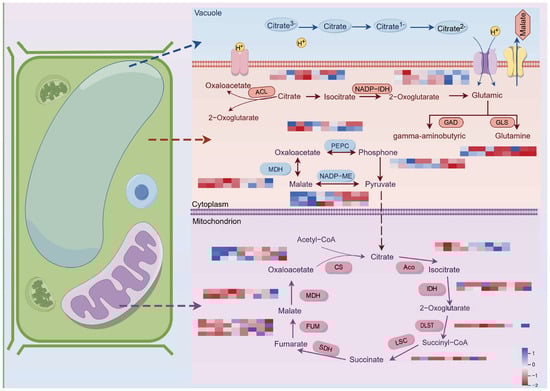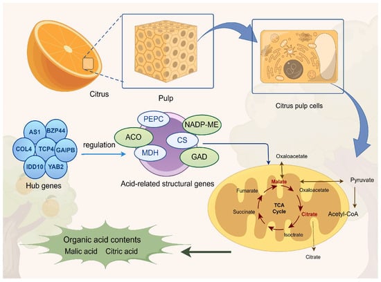 “High quality” has become essential for fresh fruits due to changes in people’s consumption conceptions and quality of life, and the flavor quality of citrus fruits is strongly affected by organic acids []. People’s sensitivity to sweetness is influenced by organic acids, and the sugar/acid ratio plays a critical role in deciding when to harvest fruit and what kind of fruit customers prefer []. Furthermore, components of the organic acid production pathway are crucial for several physiological functions, including plant growth, adversity tolerance, and intracellular pH homeostasis maintenance []. Depending on the variety and growth stage, the fruit’s organic acid types and ratios vary, and not all fruits have the same quantity of each acid []. When citrus fruits are fully ripe, 70–90% of the total organic acids are citric acid. Other organic acids are found in limited quantities in mature citrus fruits, with malic acid being the second most abundant [,]. The diversity and abundance of organic acids vary across different cultivars of fruits. Consequently, the key enzymes that influence organic acid accumulation will also differ []. The pyruvate pathway and sugar metabolism provide the essential building blocks for the synthesis of citric acid [,]. The synthesis of citric acid primarily occurs in the mitochondria of juice cells. After pyruvate enters the mitochondria to form acetyl-CoA, it enters the tricarboxylic acid cycle (TCA). This entry is facilitated by the action of enzymes such as citrate synthase (CS), aconitase (ACO), malate dehydrogenase (MDH), and isocitrate dehydrogenase (IDH) [,]. The created citric acid can be partially broken down to create energy and other metabolites, with the remainder being stored in liquid cells []. The cytoplasm of citrate is recognized to occur via three distinct pathways: the ATP-citrate lyase (ACL) pathway, the GS pathway, and the ACO-GABA pathway [,]. Glutamate decarboxylase (GAD), glutamine synthetase (GS), and ATP-citrate lyase (ACL) are the three main enzymes in the degradation pathway. Malic acid primarily transforms into oxaloacetate through the action of phosphoenolpyruvate (PEP), guided by two enzymes: PEP carboxylase (PEPC) and NAD-dependent malate dehydrogenase (NAD-cyt-MDH) within the cytoplasm []. Moreover, NADP-dependent malic enzymes (NADP-MEs) possess the ability to catalyze the reversible conversion of pyruvate into malic acid [].