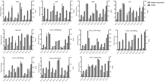 To evaluate the correctness of the RNA-Seq data, the expression levels of 11 randomly selected genes from the pathway associated with organic acid metabolism were assessed across all samples. The findings revealed concordance between the FPKM values derived from transcriptome sequencing results (Figure 8) and the qRT-PCR results. These results indicated the reliability of the transcriptome sequencing data for further investigations. Additionally, during the ripening process, the expression levels of MDH (CICLE_v10025945mg) and PEPC (CICLE_v10025088mg) exhibited a consistent increase, whereas aceE (CICLE_v10020224mg) showed a decrease in expression.