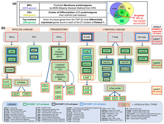 Scheme showing (a) the lists of human genes that are used in this work, indicating their size and the overlap between them: 5518 genes predicted to encode membrane proteins; 369 genes encoding known CD markers; and 363 genes corresponding to the union of unique genes from the TOP 20 most differentially expressed genes found in each of the 27 clusters of Dataset 1. The Venn diagram shows the intersections between these 3 sets of genes. Part (b) of this figure schematically shows all the hematological and immune cell types that we worked with in this study and that were detected in the 3 datasets (Datasets 1, 2, and 3). The cell types identified in each of these datasets are marked with a colored square: green squares for Dataset 1, which includes 27 cell types; black squares for Dataset 2, which includes 19 cell types; and blue squares for Dataset 3, which includes 12 cell types. The cells are organized into lineages: myeloid cells, progenitor cells, and lymphoid cells; and from less specific to more specific cell types (from top to bottom). The legend at the bottom gives the names of all the specific cell types studied. Finally, colored background panels with a red square inside are included in the figure to mark the cell types studied at different levels of dissection or cell type separation. Thus, three main levels are considered: Level 1, which includes 7 different cell types in the grey-colored panels; Level 2, which includes 16 cell types in the green-colored panels; and Level 3, which includes 27 different cell types and subtypes in the cream colored panels. This largest number of cell types (27 in Level 3) is the same defined in Dataset 1, because that study included experimental validation of the different cell populations and was therefore used as a reference in this work.