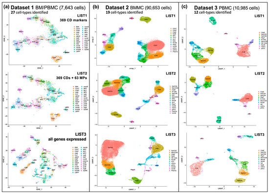 Single-cell tSNE and UMAP maps of three complementary sample cell sets obtained from peripheral blood mononuclear cells (PBMCs) and bone marrow mononuclear cells (BMMCs). (a) Three tSNE plots corresponding to the analysis of Dataset 1, which contains 7643 cells and identifies clusters corresponding to 27 different cell types. The three plots include clusters of different cell populations (i.e., different cell types or subtypes) generated using different numbers of genes: 369 CD markers (gene List 1); 369 CD markers plus 63 genes encoding membrane proteins (List 2); and all expressed genes detected in the cells of this dataset (List 3). (b) Three UMAP plots corresponding to the analysis of Dataset 2, which contains 90,653 cells and identifies clusters corresponding to 19 different cell types. The three plots were generated in the same way as indicated above, using different numbers of genes: List 1; List 2; and List 3. (c) Three UMAP plots corresponding to the analysis of Dataset 3, which contains 10,985 cells and identifies clusters corresponding to 12 different cell types. The three plots were generated in the same way as indicated above, using different numbers of genes: List 1; List 2; and List 3.