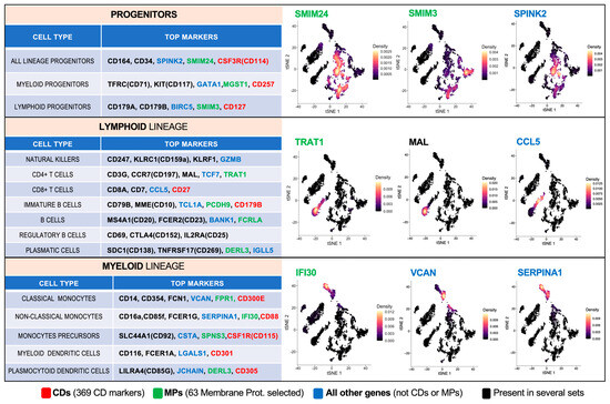 Tables on the left: selected top markers for 15 cell types: (i) 3 types of progenitor cells; (ii) 7 types of lymphoid lineage cells; and (iii) 5 types of myeloid lineage cells. Right panels: for each group of cell types, three tSNE plots corresponding to Dataset 1, showing the expression of 3 selected genes (marked in red or yellow according to the scales included in each plot). The figure also shows, in red, green, or blue, the source list of the genes (i.e., the set in which the genes are included: the CD set, the MP set, or the set that is all other genes but not CDs or MPs).