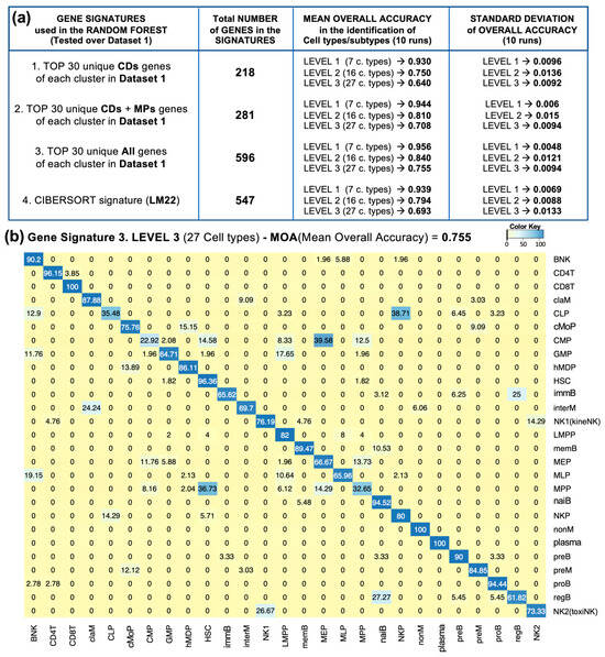 Summary of the Random Forest results obtained with the 4 gene signatures tested: (a) Table describing the 4 gene sets used in the Random Forest and the results, at 3 levels, obtained for overall accuracy (mean and sd); (b) Confusion matrix obtained after 10 runs of the test to predict the cell-type label of each of the 27 clusters of cells present in the single-cell analysis of Dataset 1.