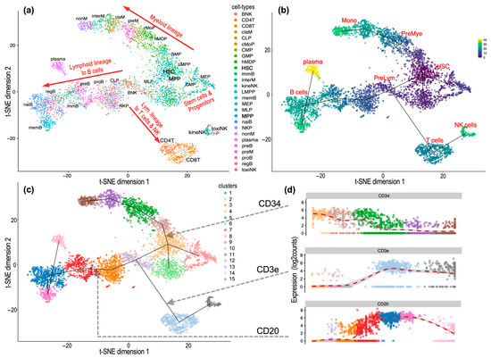 The three main trajectories found in the analysis of the single-cell map of Dataset 1, shown in the t-SNE plots (Figure 6a–c), reflect that the expression profiles of the cell populations move or evolve from stem cells (HSCs) to monocytes (Mon), revealing the myeloid lineage; move from stem cells (HSCs) to B lymphocytes (B cells and plasma cells), revealing the B lymphoid lineage; and move from stem cells (HSCs) to T lymphocytes (T cells and NK cells), revealing the T-lymphoid lineage.