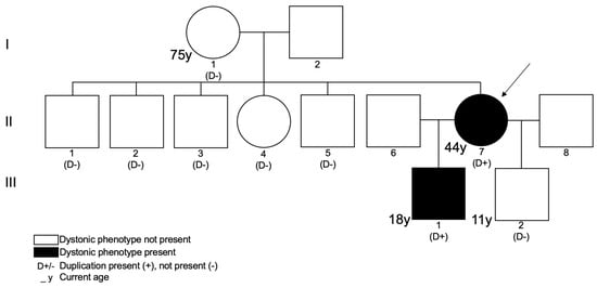 We report the case of a 44-year-old woman (II7 on Figure 1) with a generalized dystonia associated with slight cognitive impairment with learning difficulties and behavior problems. She presented with lower limb dystonia at the age of 12, which slowly progressed to generalized dystonia affecting speech, the cranial–cervical region, and limbs. Irregular hand tremors and brisk reflexes were also noted. The dystonia was always mild and never disabling, but due to cognitive and behavioral problems, this patient has been unable to sustain professional activities over the years, despite multiple attempts at securing employment. This situation necessitated her integration into an institution for individuals with special needs, where occupational therapy could be provided. The patient never presented dysmorphic features. She has been symptomatically treated with levodopa, trihexyphenidyl, and botulinum toxin.