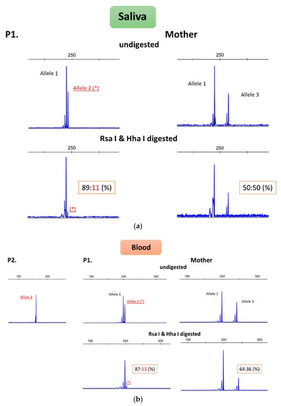 Results of X chromosome inactivation studies in patient II7 (here referenced as P1), her mother, and affected son III1 (here referenced as P2). X chromosome inactivation studies were performed on DNA extracted from saliva (a) and blood (b). The top figures depict PCR of the HUMARA gene without prior digestion, showing different size alleles. PCR amplification was also performed on DNA previously digested with Rsa I and Hha I enzymes. Effective digestion occurs when the DNA is unmethylated (these enzymes are sensitive to methylation). Therefore, after this step, the peak corresponding to the active allele will be smaller. By comparing the two peak areas, it is possible to determine the percentage of inactivation (ideally it should be 50:50%, indicating X chromosome random inactivation). In patient II7, the mutated chromosome (allele 2) is preferentially activated, whereas in the mother, the pattern suggests random inactivation. * represents the X chromosome allele carrying the duplication, which is not methylated in II7.