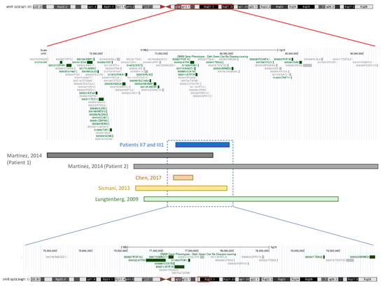Physical map of the duplicated Xq13.3-q21.1 region in patients II7 and III1 (in blue), along with the duplicated regions involved in previously reported cases, as mentioned in Table 1 (in grey, patients described by Martinez et al. [12]; in orange, patient described by Chen et al. [13]; in yellow, patient described by Sismani et al. [14]; in green, patient described by Lugtenberg et al. [15]; adapted from the UCSC Genome Browser (https://genome.ucsc.edu/ (accessed on 1 October 2024)).