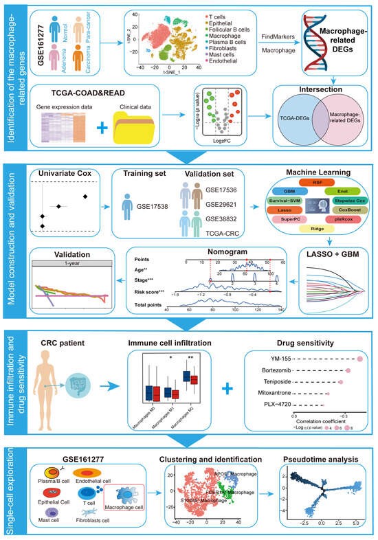 Given the pivotal role of macrophages in shaping the TME and modulating immune responses, identifying macrophage-specific biomarkers is crucial for predicting the survival of CRC patients. Currently, advancements in single-cell RNA-seq (scRNA-seq) technology have revolutionized cancer research, allowing us to analyze gene expression patterns, and discover distinct cell populations and their associated biomarkers at the single-cell level [11]. This study integrated scRNA-seq and bulk RNA-seq data to systematically identify macrophage-related prognostic biomarkers. The MRPS was developed by using a comprehensive machine learning framework that combines 101 distinct algorithm combinations. The predictive performance of the MRPS was evaluated through Kaplan–Meier (KM) survival curve and receiver operating characteristic (ROC) curve analyses in both the training and multiple validation datasets. Additionally, a nomogram incorporating the MRPS was constructed to provide a quantitative tool for clinical prognosis prediction. The study also assessed the response of different risk groups to immune therapy and identified drugs targeting specific subgroups. The results demonstrated that the MRPS effectively predicted the prognosis of CRC patients and was closely associated with their response to drug treatments, laying a foundation for further mechanistic studies and clinical applications. The analysis workflow for this study is illustrated in Figure 1.