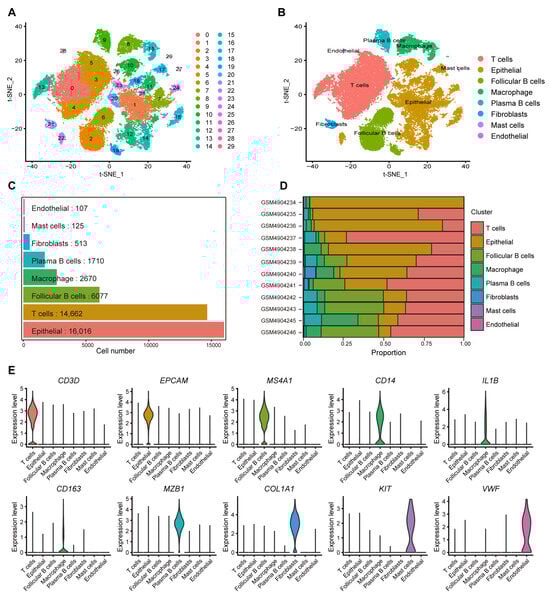 The “Seurat” R package (version 5.0.3) [35] was used for quality control, analysis, and exploration of the scRNA-seq dataset GSE161277. Firstly, according to the study by Zheng et al. [34], cells with fewer than 200 total genes or with a mitochondrial gene proportion greater than 25% were excluded. Cells with fewer than 200 genes are typically considered as low-quality or damaged cells, indicating incomplete transcriptome coverage. Similarly, a mitochondrial gene proportion exceeding 25% suggests that the cell is in a stressed or dying state, likely due to cytoplasmic RNA leakage, leaving predominantly mitochondrial RNA [36]. Genes with an expression level exceeding 200 and expressed in at least three cells were retained. LogNormalize method was applied for data normalizing and the top 2000 highly variable features were identified using the FindVariableFeatures function. Next, principal component analysis (PCA), a linear dimensionality reduction technique, was conducted on the top 2000 highly variable features. The RunHarmony method was employed to correct for batch effects across samples. Based on the elbow plot, 40 principal components were retained. The FindNeighbors and FindClusters functions were then used to cluster these cells. Cell clusters were annotated using the “CellMarker 2.0” (http://bio-bigdata.hrbmu.edu.cn/CellMarker/ (accessed on 26 April 2024)) database, based on the typical biological markers of each cell type.