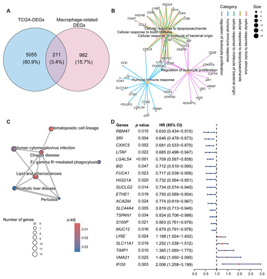 To identify key genes involved in CRC development, differential expression analysis was performed on normal and tumor samples from the TCGA-CRC dataset using the “DESeq2” R package (version 1.42.1). A total of 5266 DEGs were identified based on the criteria of |log2(FC)| > 1 and p.adj < 0.05. Subsequently, by taking the intersection of macrophage-specific genes from the scRNA-seq dataset with DEGs from the bulk RNA-seq dataset, 211 macrophage-related genes were identified in CRC (Figure 3A). As shown in Figure 3B, those macrophage-related genes in CRC were mainly enriched in immune-related biological process items, including “Cellular response to biotic stimulus”, “Cellular response to lipopolysaccharide”, “Cellular response to molecule of bacterial origin”, “Humoral immune response”, and “Regulation of leukocyte proliferation”. In addition, those macrophage-related genes in CRC were significantly involved in KEGG pathways, such as “Hematopoietic cell lineage”, “Lipid and atherosclerosis”, “Chagas disease”, “Human cytomegalovirus infection”, “Fc gamma R-mediated phagocytosis”, “Pertussis”, and “Alcoholic liver disease” (Figure 3C). Moreover, 20 macrophage-related genes with prognostic significance in CRC were identified through univariate Cox regression analysis (Figure 3D).