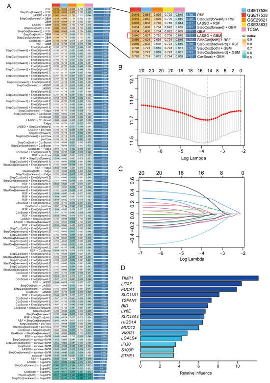 Construction of 15-gene MRPS based on machine learning approaches. (A) A total of 101 algorithm combinations were employed to construct prognostic models in CRC and the C-index value of each model was subsequently calculated across all validation datasets. (B) Calculation of the optimal lambda value. (C) Determination of the coefficients of independent variables by LASSO Cox regression analysis. (D) The regression coefficients for the 15 genes identified in the GBM.