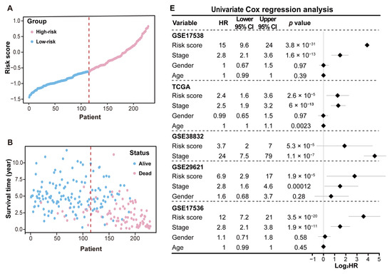 Moreover, transcriptomic datasets GSE17538 (n = 244), GSE17536 (n = 177), GSE29621 (n = 65), and GSE38832 (n = 122) based on the Affymetrix GPL570 platform were also collected from the GEO database. The signal intensities in the three datasets were normalized using the robust multi-array average (RMA) algorithm. Cases with incomplete clinical information or an OS or DSS of less than one month were excluded. The GSE17538 dataset, which includes clinical information (e.g., OS, gender, stage, and age), was used as the training set to construct the prognostic signature. The GSE17536 dataset with clinical information (e.g., OS, gender, stage, and age), the GSE29621 dataset with clinical information (e.g., OS, gender, and stage), along with the GSE38832 dataset with clinical information (e.g., DSS and stage), were used as validation cohorts.