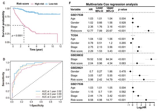 In addition, to assess the independent capability of the MRPS in predicting OS or DSS, univariate and multivariate Cox regression analyses were conducted across five datasets: GSE17538, GSE17536, GSE29621, GSE38832, and TCGA-CRC. Univariate analysis showed that the risk score and clinical stage had Hazard ratios (HRs) greater than 1 across all datasets (p < 0.05), indicating a significant impact on CRC survival (Figure 5A). Multivariate Cox regression analysis confirmed the risk score as an independent prognostic factor in the GSE17538, GSE17536, GSE29621, and TCGA-CRC cohorts (p < 0.05). However, in the GSE38832 dataset, although the HR for the risk score was greater than 1, the p-value was not significant (p > 0.05), indicating that the model cannot be used as an independent prognostic factor for DSS in CRC (Figure 5B).