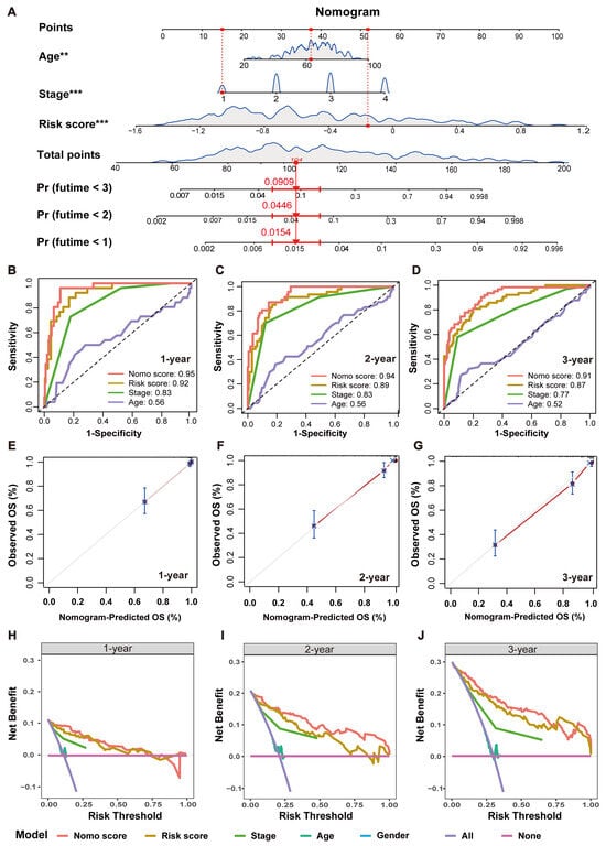 To enhance the clinical applicability of the MRPS, we constructed a nomogram incorporating the MRPS-derived risk score and clinical characteristics such as age and stage (Figure 6A). As shown in Figure 6B–D, the nomogram achieved AUC values of 0.95, 0.94, and 0.91 at 1-year, 2-year, and 3-year intervals, respectively, indicating its high predictive accuracy. The calibration curves show good agreement between the nomogram’s predictions and actual observations (Figure 6E–G). In addition, decision curve analysis (DCA)indicated that the nomogram could provide better net clinical benefit than other clinical characteristics (Figure 6H–J). These findings highlight the potential of a nomogram as a reliable and accurate tool for personalized prognosis prediction in CRC patients.