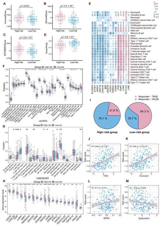 Immune landscape variations between high- and low-risk groups in CRC. (A–D) The immune score (A), stromal score (B), tumor purity (C), and ESTIMATE score (D) were applied to quantify the different immune status between the high-risk and low-risk groups. (E) Correlation between the expression levels of the 15 MRPS-related genes and the levels of immune cell infiltration. (F,G) The abundance of each TME-infiltrated cell type between the high- and low-risk groups, quantified by the ssGSEA algorithm (F) and CIBESORT algorithm (G). (H) The expression levels of 19 immune checkpoint genes between the high-risk and low-risk groups. (I) Proportion comparison of CRC patients responding to immunotherapy between the high-risk and low-risk groups. (J–M) Association of risk score with TIDE score (J), exclusion score (K), MDSC cell score (L), and dysfunction score (M). * p < 0.05; ** p < 0.01; *** p < 0.001; **** p < 0.0001.