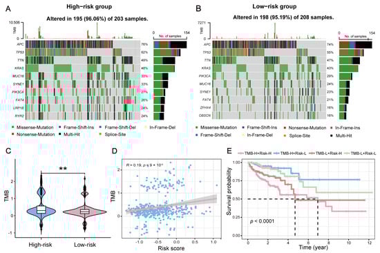 Impact of TMB on the survival of CRC patients with distinct risks. (A) Top 10 genes with the highest mutation rates in the high-risk group. (B) Top 10 genes with the highest mutation rates in the low-risk group. (C) Analysis of the difference in TMB values between the high-risk and low-risk groups. (D) Correlation analysis between TMB values and risk scores. (E) The KM curves for four CRC patient groups: TMB-H + Risk-H, TMB-H + Risk-L, TMB-L + Risk-H, and TMB-L + Risk-L. The dashed lines indicate the survival time (vertical lines) at which the survival probability reaches 0.50 (horizontal lines) for patients in the TMB-H + Risk-H and TMB-L + Risk-H groups. ** p < 0.01.