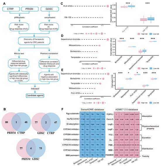Identification of potential therapeutic drugs for patients with CRC. (A) Flowchart of the process for screening potential therapeutic drugs for CRC based on the GDSC, CTRP, and PRISM databases. (B) Intersection of potential therapeutic compounds screened from the GDSC, CTRP, and PRISM databases. (C) Screening outcomes for potential therapeutic drugs (PLX-4720 and YM-155) in the CTRP database. (D) Screening outcomes for potential therapeutic drugs (YM-155, Mitoxantrone, Bortezomib, Teniposide) in the PRISM database. (E) Screening outcomes for potential therapeutic drugs (YM-155, Bortezomib, Teniposide, Mitoxantrone, PLX-4720) in the GDSC database. (F) Analysis of the ADMET properties of potential therapeutic drugs using the ADMETlab 2.0 and SwissADME databases. * p < 0.05; *** p < 0.001.