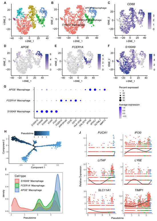 Pseudotime trajectory analysis of macrophage subclusters. (A) The t-SNE plot of macrophages in CRC. Cells were clustered into six clusters and colored by clusters. (B) The t-SNE plot of macrophage subtypes in CRC. (C–F) The t-SNE plots showed expression levels of CD68, APOE, FCER1A, and S100A9 in macrophages. (G) Dot plot showed top five marker genes of APOE+, FCER1A+, and S100A9+ macrophages. (H) Pseudotime plot showed the developmental trajectory of macrophages, with colors ranging from dark blue to light blue indicating pseudotime scores from low to high. (I) The density plot showed pseudotime trajectory of the APOE+, FCER1A+, and S100A9+ macrophage subclusters. (J) The expression levels of FUCA1, IFI30, LITAF, LY6E, SLC11A1, and TIMP1 along the pseudotime trajectory across the APOE+, FCER1A+, and S100A9+ macrophage subclusters. The colors correspond to the three macrophage subpopulations: red for S100A9+ macrophages, green for FCER1A+ macrophages, and blue for APOE+ macrophages.
