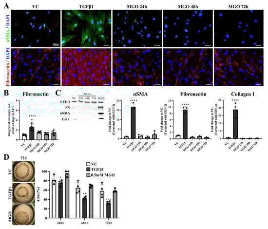 Examination of myofibroblast activation on MGO-treated fibroblasts. (A) Immunofluorescence results showed a significantly increased expression of αSMA (labeled in green) as well as fibronectin (labeled in red) in cells from the TGFβ1 group but not in that from the MGO groups. (B) Quantification analyses of immunofluorescence staining showed a 2-more fold increase in fibronectin expression in cells from the TGFβ1 group compared with the VC group. No differences were observed between the MGO-treated groups and the VC group. (C) Results of the Western blot showed that only cells treated with TGFβ1 induced a significant increase in protein expression of αSMA, fibronectin, and collagen I. (D) Collagen assay showed a significant shrinkage of fibroblast-laden collagen gels in the TGFβ1 group when compared with the VC group at all time points. However, treatment of 0.5 mM MGO causes no differences regarding the area of collagen gels, indicating that MGO-treated fibroblasts shared similar contraction ability with normal fibroblasts. Asterisks indicated significant differences between groups (**** p < 0.0001, *** p < 0.001, ** p < 0.01, * p < 0.05). Images from 10 different fields in each group were evaluated, and representative images were presented.