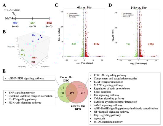 NGS results of MGO-stimulated mesothelial cells revealed distinct transcriptomic signatures between different treating times. (A) Experimental design of the samples that were sent to perform NGS analyses. (B) Distinct characteristics of transcriptome can be seen in cells among different MGO-treated times by PCA. Samples collected at time points of 0 h, 6 h, and 24 h were labeled in blue, green, and red colors, respectively. (C) 1182 upregulated DEGs and 828 downregulated DEGs were detected when comparing transcriptomic profiles at the time point of 6 h with 0 h. (D) 1725 upregulated DEGs and 791 downregulated DEGs were detected when comparing transcriptomic profiles at the time point of 24 h with 0 h. (E) Venn diagram showed that more than half of the DEGs from “6 h vs. 0 h” and “24 h vs. 0 h” were overlapped. DEGs from areas I, II, and III were sent to analyze the corresponding pathways, and the significant pathways (p < 0.05) were listed respectively.