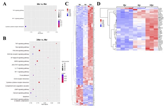 Pathways associated with inflammation and fibrosis were significantly altered upon MGO stimulation on mesothelial cells. (A,B) Pathway enrichment analysis of “6 h vs. 0 h” and “24 h vs. 0 h” using the KEGG database showed that MGO initiated pathways that related with inflammation, apoptosis, cytokine–receptor response, and ECM–receptor response on MeT-5A. (C) DEGs involved in those significantly changed pathways were shown in the heatmap. Some DEGs were upregulated gradually along the treating time, while others were downregulated after being treated MGO for 6 h. (D) DEGs of cytokines and growth factors that commonly participated in inflammatory or fibrotic processes were listed.