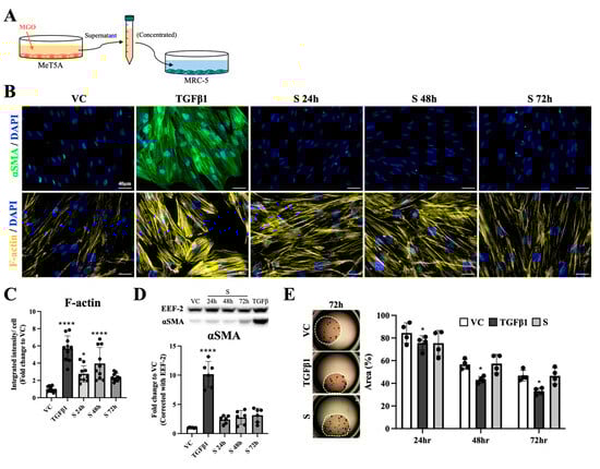 Characterization of the cytoskeleton on fibroblasts treated with supernatant generated by MGO-stimulated mesothelial cells. (A) Experimental setting to investigate the effects of MGO-stimulated mesothelial cells on fibroblasts. (B) Immunofluorescence staining showed significantly increased expression of αSMA (labeled in green) and F-actin (labeled in yellow) on cells from the TGFβ1 group. Although no signals of αSMA were observed on supernatant-treated cells, increased signals of F-actin were noted compared with cells in the VC group. (C) Quantification analyses showed significantly elevated signals of F-actin on cells treated with TGFβ1 and cells treated with supernatant for 24 and 48 h. (D) Western blot showed that fibroblasts treated with TGFβ1 expressed significantly higher αSMA, and fibroblasts treated with supernatant expressed similar αSMA with normal fibroblasts. (E) In the contraction assay, the area of MRC-5-laden collagen gels was significantly decreased in the TGFβ1 group, but no differences were found between the supernatant group and the VC group. Asterisks indicated significant differences between groups (**** p < 0.0001, * p < 0.05). For each experimental condition, 10 images were evaluated, and representative images were presented.