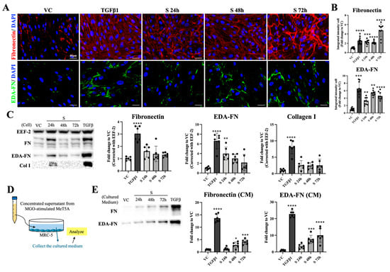 Evaluation of inter- and extracellular expression of ECM proteins on supernatant-treated fibroblasts. (A) Immunofluorescence staining showed increased signals of fibronectin and EDA-FN on both TGFβ1- and supernatant-treated fibroblasts. (B) Quantification analyses showed that both fibronectin and EDA-FN were significantly increased on fibroblasts from the TGFβ1 group and supernatant groups. (C) Protein expressions of fibronectin, EDA-FN, and collagen I were examined using a Western blot. For fibronectin and collagen I, elevated expressions were only observed on fibroblasts treated with TGFβ1. As for EDA-FN, fibroblasts treated with TGFβ1, as well as those treated with supernatant for 24 h, expressed significantly higher amounts than normal fibroblasts. (D) Illustration for samples that were used to probe fibronectin and EDA-FN in the following Western blot experiment. (E) The same volume of the cultured medium collected from each condition was loaded into each well of the SDS page and ran the Western blot. Significantly increased expressions of fibronectin and EDA-FN in the cultured medium were noted in the TGFβ1 group, supernatant 48 h, and supernatant 72 h group. Asterisks indicated significant differences between groups (**** p < 0.0001, *** p < 0.001, ** p < 0.01, * p < 0.05). Images from 10 different fields in each group were evaluated, and representative images were presented.