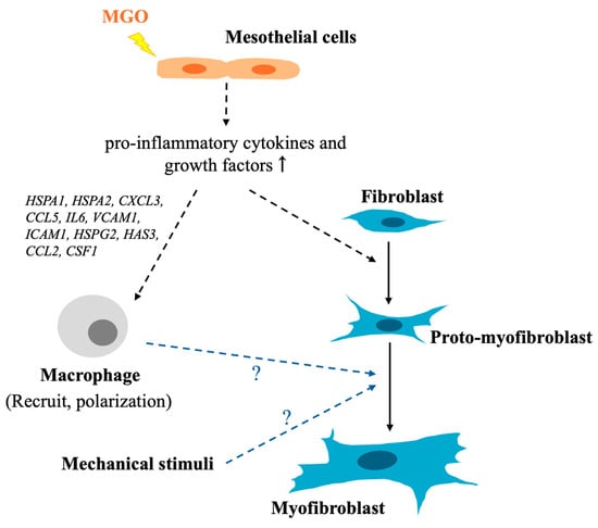 Summarized illustration of the findings in this study. Upon the administration of MGO, genes involved in pro-inflammatory and fibrotic pathways were significantly upregulated in mesothelial cells. Then, the secretions from these stimulated mesothelial cells further activated the fibroblasts into proto-myofibroblasts, which were distinct from αSMA+ myofibroblasts but also demonstrated an increase in stress fibers and elevated ECM production ability. Upregulated genes being responsible for recruiting macrophages and promoting M1 polarization were also noted and indicated a possible role for macrophages to complete the activation of myofibroblasts.