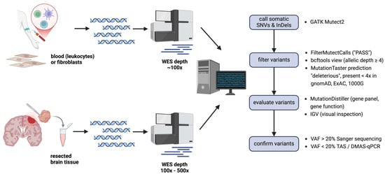 Single steps performed to identify pathogenic somatic variants in brain biopsy specimens. Mutect2: GATK tool for somatic variant calling; FilterMutectCalls: GATK tool to filter real Mutect2 calls from errors, artifacts, germline variants, and more, probable somatic variants are given the flag “PASS”; bcftools: a tool to manipulate vcf files. It was used to keep only calls with an allelic depth of ≥4); MutationTaster: online variant prediction tool to distinguish pathogenic from benign variants, this tool was also used to filter out common variants from gnomAD, ExAC, and 1000G; MutationDistiller: online variant prioritization tool, used to apply different virtual gene panels taking into account the clinical phenotype of the patients and to prioritize variants based on assumed gene function (pathway-based); IGV: genome browser to display WES data. Abbreviations: DMAS-qPCR, double-mismatch allele-specific quantitative polymerase chain reaction; InDel, insertion and deletion, SNV, single nucleotide variant; TAS, targeted amplicon sequencing; VAF, variant allele frequency; WES, whole exome sequencing. The image was created with BioRender.