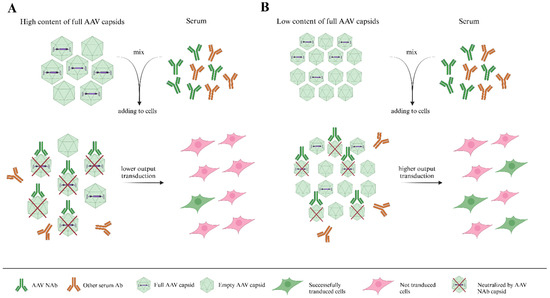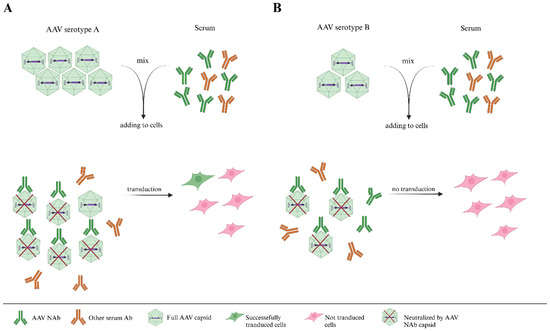 A figure illustrating the importance of the variance in the multiplicity of infections (MOIs) of adeno-associated virus (AAV) serotypes. Chosen doses of serotype A (subfigure (A)) and serotype B (subfigure (B)) transduce an equal number of target cells in the absence of serum antibodies. However, in the presence of an equal volume/number of specific AAV antibodies from serum, the levels of transduced target cells are different, which reflects the lower obtained viral dosage of serotype A, rather than the difference in antigenic characteristics between the two serotypes.