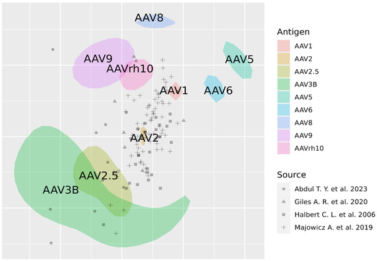 Over the past decades, many different studies have been conducted that have assessed the prevalence of neutralizing antibodies against various AAV serotypes in diverse human populations [4,7,89]. Such investigations not only provide critical information about the percentage of seropositive individuals (and hence the potential for the clinical use of a particular virus variant) but also allow the assessment of antigenic similarities between different AAV serotypes. However, these data are often segmental and difficult to visualize and analyze.