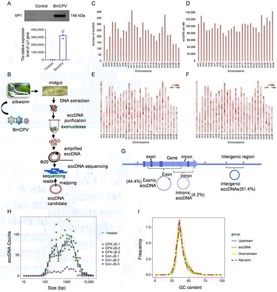 To determine whether BmCPV infected the silkworm, the expression level of VP1 after virus infection was measured by Western blot and qPCR. The results demonstrated that VP1 expression level increased significantly after virus infection, indicating that the silkworms were infected with BmCPV (Figure 1A). Circle-seq was used to investigate the eccDNAs in the silkworm midgut (Figure 1B). The numbers of clean reads for BmCPV-infected (CPV-JS) and BmCPV-uninfected (Con-JS) silkworm midguts were 221,622,188, 196,398,878, 153,274,728, 148,146,262, 146,211,074, and 137,778,670, respectively (Table 1). Following the filtering of low-quality data with Circle-Map, we identified 5508 eccDNAs in total (Circle score > 0). The mapping of eccDNAs in the genome was conducted based on their originating chromosomes. An analysis of the number of eccDNAs formed on each chromosome revealed that chromosome 11 forms 336 eccDNAs, with the highest number, while chromosome 2 forms 79 eccDNAs, with the lowest number (Figure 1C). Additionally, chromosome 28 produced the highest number of eccDNAs per MB at 120,933, whereas chromosome 11 produced the lowest, with 61,266 eccDNAs per MB (Figure 1D). These eccDNAs were detectable on all chromosomes, but the hotspots that generate eccDNA vary across each chromosome. (Figure 1E,F). Based on their localization, eccDNAs were classified as either intergenic (51.4%) or genic (48.6%), the latter mostly derived from exons (Figure 1G). The size range of these eccDNAs was from 72 bp to 17 kb, although most were between 100 and 1000 bp (Figure 1H). There was similar enrichment of GC contents in eccDNA sequences of silkworm midgut compared with other genomic regions (Figure 1I). This is inconsistent with previous reports that high GC content is a typical characteristic of eccDNAs [].
