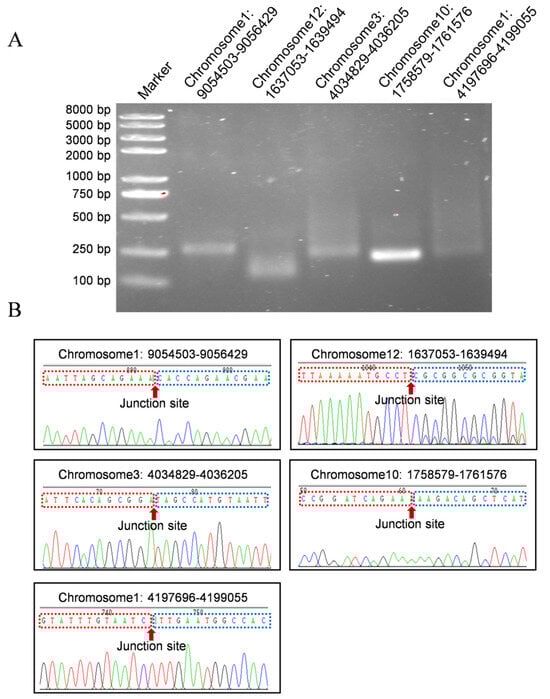 Outward-directed PCR primers were employed to validate the junction site of the detected eccDNAs (Table 4). The PCR reaction was conducted according to the manufacturer’s instructions (Takara, Japan). The PCR products were analyzed using 1% agarose gel electrophoresis. Subsequently, the recovered products were cloned into the pMD-19T vector (TaKaRa, Dalian, China) for Sanger sequencing.