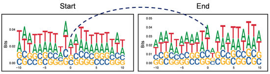For each eccDNA locus, the nucleotide sequence of the 10 bp flanking the 3′ and 5′ breaking points were analyzed. Using computer simulation, we computed the expected frequency of each motif, and new positions in the genome for each eccDNA length were randomly assigned using WebLogo (http://weblogo.berkeley.edu/logo.cgi) (accessed on 1 December 2023).