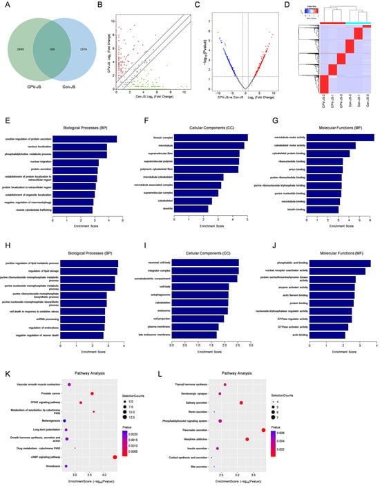 Expression patterns of ecccDNA in BmCPV-infected and uninfected midgut and functional annotation of differentially expressed eccDNAs. (A) The quantity of eccDNA co-expressed in BmCPV-infected and uninfected silkworm midguts. CPV-JS represents BmCPV-infected group. Con-JS represents BmCPV-uninfected group. (B) The scatter plot of differentially expressed eccDNAs. (C) The volcano plots of differentially expressed eccDNAs. (D) Heat map and hierarchical clustering of eccDNAs. (E–J) The biological processes, cellular components, and molecular functions are associated with the up-regulated (E–G) and down-regulated (H–J) eccDNAs. (K,L) Analysis of KEGG pathways related to the up-regulated (K) and down-regulated (L) eccDNAs.