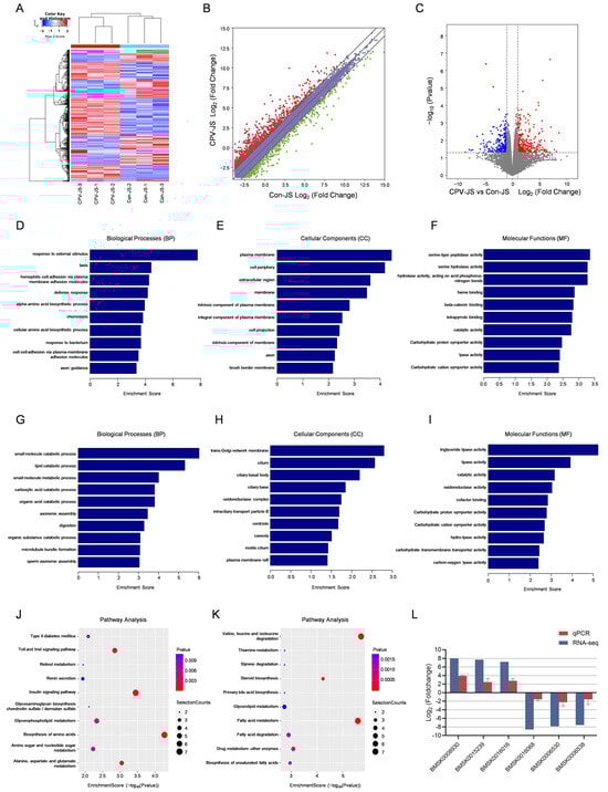 Association of DEGs with BmCPV infection. (A) The clustering plot of DEGs. (B) The scatter plot of DEGs. (C) The volcano plots of DEGs. (D–I) The biological processes, cellular components, and molecular function related to the up-regulated (D–F) and down-regulated (G–I) genes. (J,K) Analysis of KEGG pathways associated with the up-regulated (J) and down-regulated (K) genes. (L) qPCR validation of RNA-Seq results.