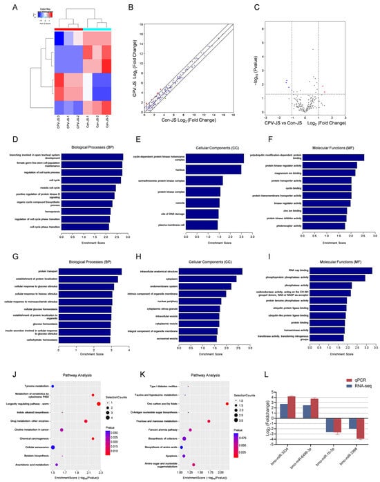 DEMs with BmCPV infection. (A) The clustering plot of DEMs. (B) The scatter plot of DEMs. (C) The volcano plots of DEMs. (D–I) The biological processes, cellular components, and molecular function related to the up-regulated (D–F) and down-regulated (G–I) miRNAs. (J,K) Analysis of the KEGG pathways associated with the up-regulated (J) and down-regulated (K) miRNAs. (L) qPCR validation of miRNA-Seq results.