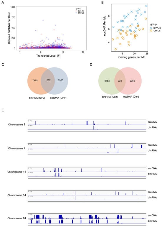 Circular DNA occurs commonly in nature, particularly in bacteria and yeast, where it often occurs within bacterial plasmids or mitochondrial DNA. Extrachromosomal circular DNA (eccDNA), closed circular DNA that originates from chromosomes but exists independently of chromosomal DNA, can be either single- or double-stranded. Although eccDNA was observed using electron microscopy as early as 1965 [], it was thought to represent garbage fragments of DNA outside of chromosomes and attracted little research attention. It is now known that eccDNA occurs widely within cells, and that various eukaryotic chromosomes such as yeast [], nematodes [], Drosophila [], pigeons [], Oxytricha [], humans [,,], and plants [,,] can form it. EccDNA can increase oncogene copy number by carrying them [], promote their amplification through autonomous replication [], and enhance their plasticity and instability [,]. The latest research indicates that eccDNA can function as a mobile enhancer to modulate gene expression []. Additionally, it has been discovered that eccDNA possesses autonomous transcriptional activity, regulating gene expression by producing RNA []. Despite this, few studies have examined changes in organisms before and after viral infection. Moreover, the function of host eccDNA in the context of viral infection remains unclear.