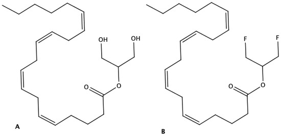 The use of 2-AG in biological experiments is associated with several difficulties since its molecule can undergo oxidation by the enzymes of the arachidonic acid cascade [28], as well as the hydrolysis of the ester bond and acyl migration. In the context of biological experiments, both the oxidation and hydrolysis of the ester group will be rather slow processes under physiological conditions and will only be significant in experiments lasting more than 4 h [29]. 2-Monoglycerides are subject to acyl migration because the 1(3)-isomer is thermodynamically more stable than the 2-isomer. The reaction continues until equilibrium is reached, and the equilibrium mixture contains no more than 5–10% of the 2-isomer [29]. Therefore, there is no certainty that the experimenter acts on the object with 2-AG, and not a mixture of 1,3-isomers. To avoid acyl migration, we synthesized an analog of 2-AG in which the hydroxyl groups were replaced by a fluorine atom. The electronic properties and relatively small size of the fluorine atom give it considerable versatility as a biosphere, and it can act as a functional mimetic of hydroxyl and other functional groups [30]. We used this approach to synthesize the fluorinated analog of 2-AG.