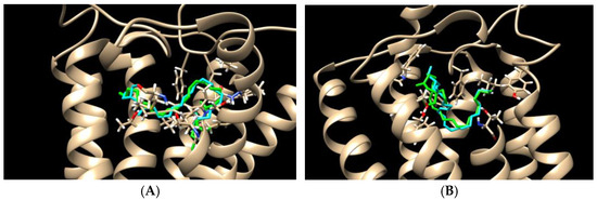 Molecular docking of 2-ADFP in the active site of the CB1 (A) and CB2 (B) receptors. Cyan, 2-ADPG; green, 2-AG.