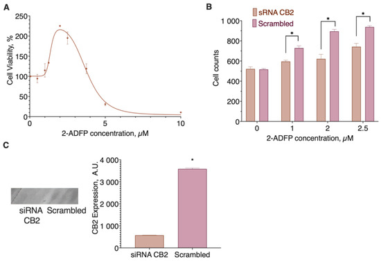 CB2 receptor role in the DU145 cell line response to the 2-ADFP action. (A) The influence of 2-ADPG concentration on cell viability; (B) the effect of the CB2 receptor knockdown on the pro-proliferative 2-ADFP activity; (C) the siRNA knockdown of the CB2 receptor in the DU 145 cell line. Incubation time 72 h, resazurin test, mean ± standard error (N = 4 experiments). *, a statistically significant difference from the cells transfected with the scrambled siRNA, p ≤ 0.05, ANOVA with Holm–Sidak post-test (B) and Student’s t-test (C).
