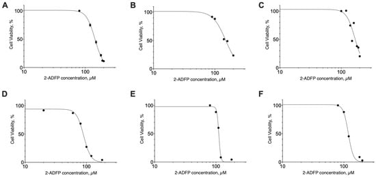 The effect of 2-ADFP on breast cancer cell line proliferation. Incubation time 72 h, resazurin test, mean ± standard error (N = 4 experiments). (A) MCF-10A, (B) MCF-7, (C) BT-474, (D) SK-BR-3, (E) BT-20, and (F) MDA-MB-231.
