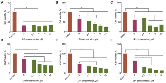 The effect of 2-ADFP combination with LPI on breast cancer cell line viability. Incubation time 72 h, resazurin test, mean ± standard error (N = 4 experiments). (A) MCF-10A, (B) MCF-7, (C) BT-474, (D) SK-BR-3, (E) BT-20, and (F) MDA-MB-231. *, a statistically significant difference from 2-ADFP alone, p ≤ 0.05, ANOVA with Holm–Sidak post-test; **, a statistically significant difference from the non-treated control, p ≤ 0.05, ANOVA with Holm–Sidak post-test.