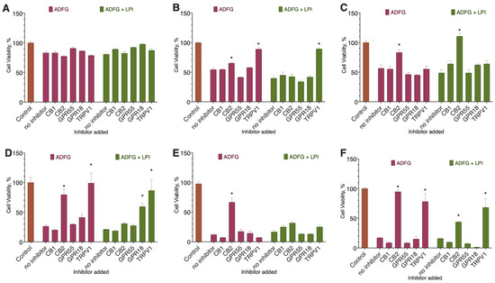 The effect of receptor blockers on the effect of 2-ADFP (EC50-EC70) combination with LPI (5 µM) on breast cancer cell line viability. The following substances and concentrations were used: CB1, SR 141716A (100 nM); CB2, SR 144528 (100 nM); GPR55, ML-193 (2 µM); GPR18, PSB CB5 (3 µM); and TRPV1, capsazepine (5 µM). Incubation time 72 h, resazurin test, mean ± standard error (N = 4 experiments). (A) MCF-10A, (B) MCF-7, (C) BT-474, (D) SK-BR-3, (E) BT-20, and (F) MDA-MB-231. *, a statistically significant difference from 2-ADFP alone, p ≤ 0.05, ANOVA with Holm–Sidak post-test.